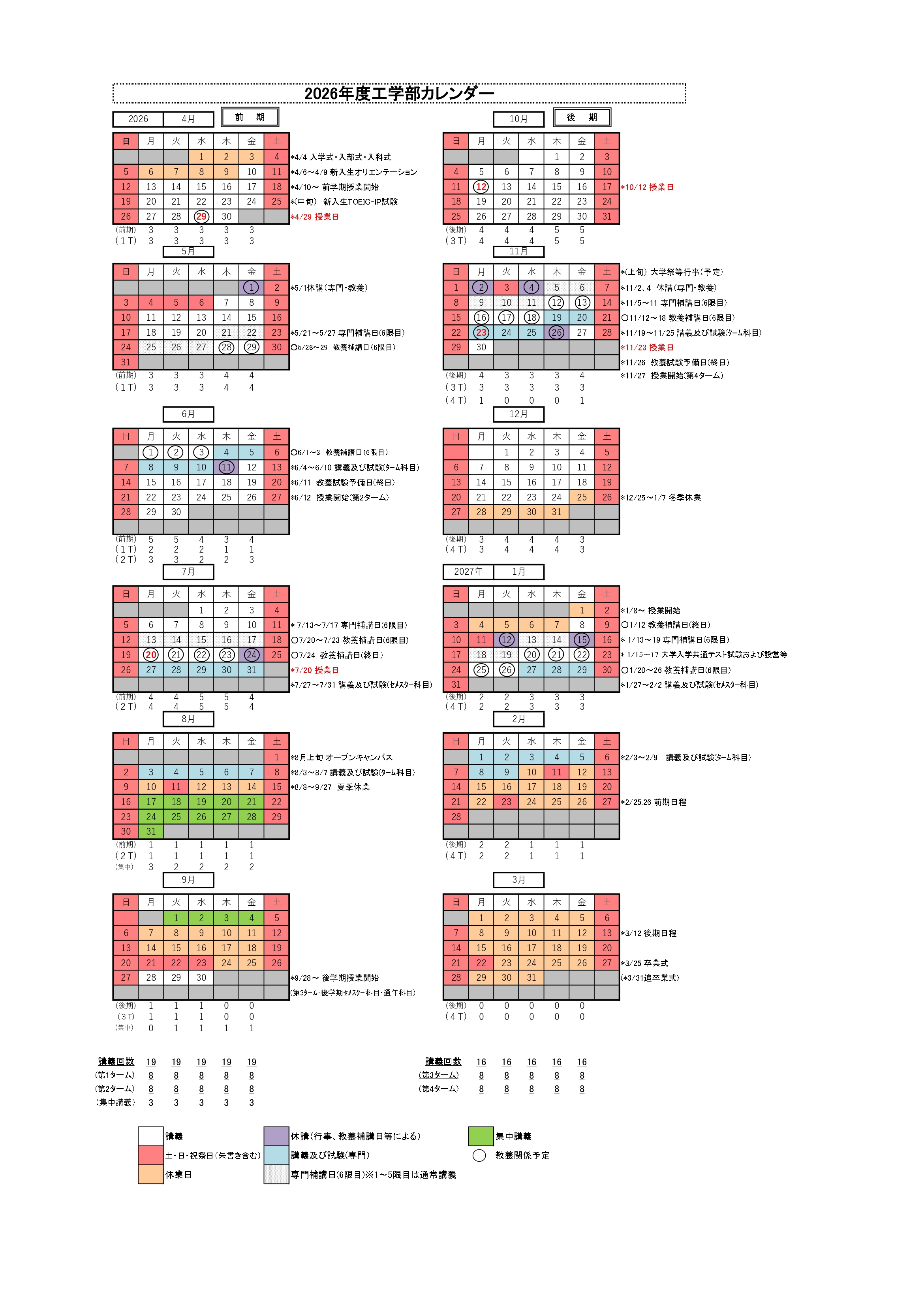2026年度工学部カレンダー